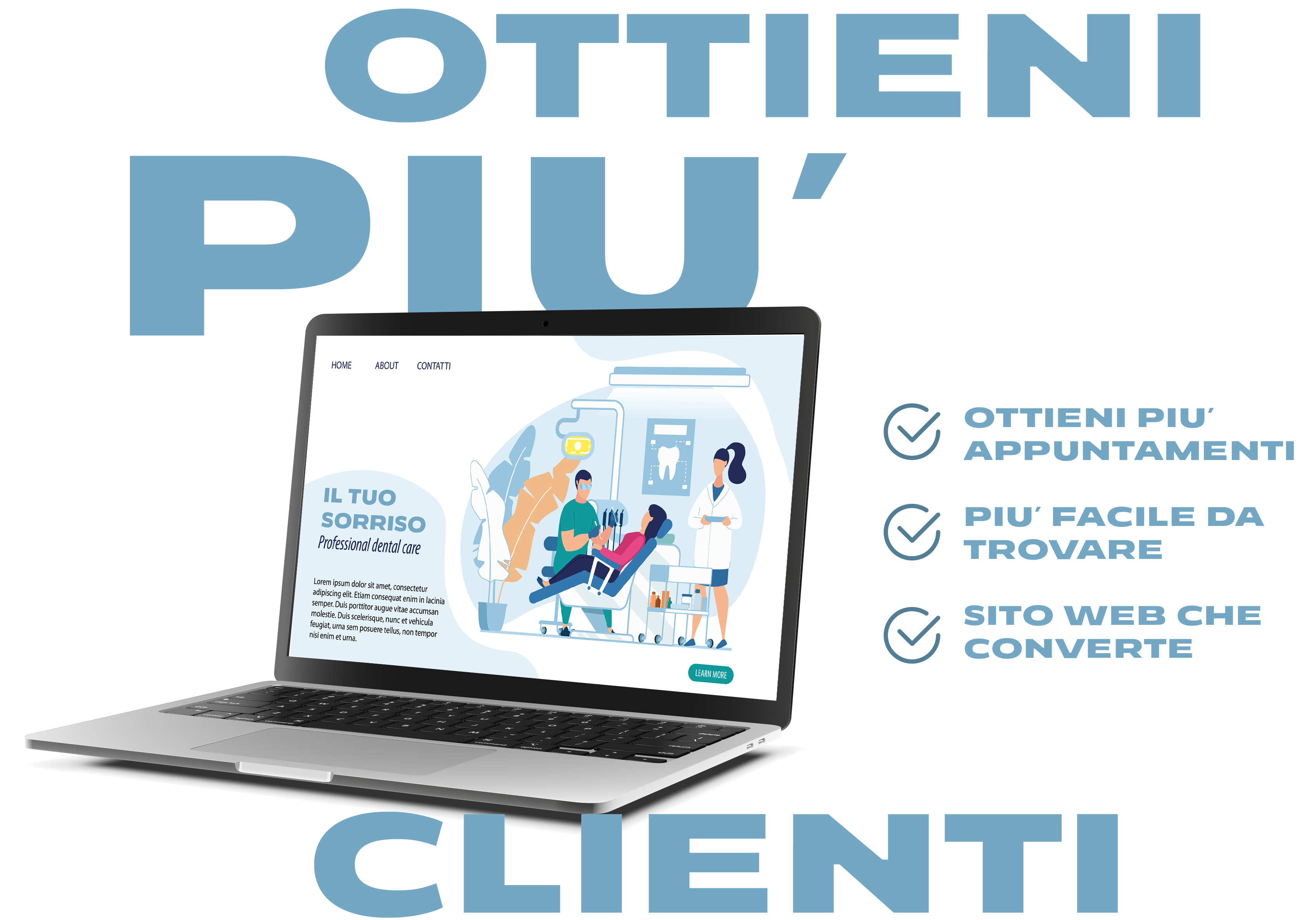 Ci occupiamo di creare e gestire il sito web del tuo studio dentistico per farlo comparire tra i primi risultati quando qualcuno cerca un dentista vicino a te.